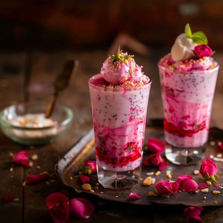 Creamy kulfi served with silky falooda noodles, rose syrup, and sweet basil seeds, topped with dry fruits. Kulfi Falooda is a chilled, indulgent dessert perfect for beating the heat.